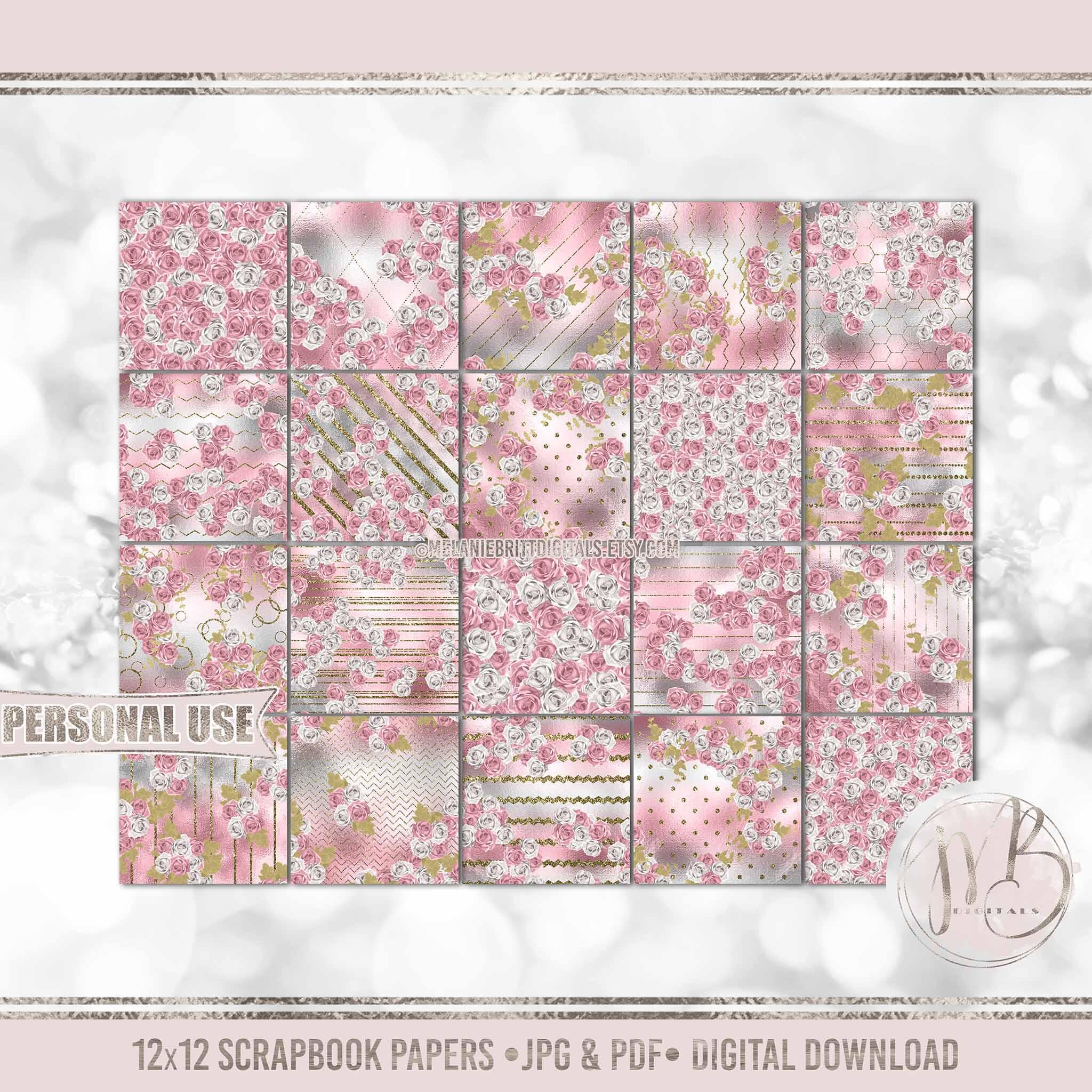 pink rose paper, gold glitter, floral digital paper, patterned paper, printable paper, scrapbook paper, digital download, digital scrapbooking, floral paper design, rose digital paper, floral scrapbook, for paper crafts, melaniebrittdigitals