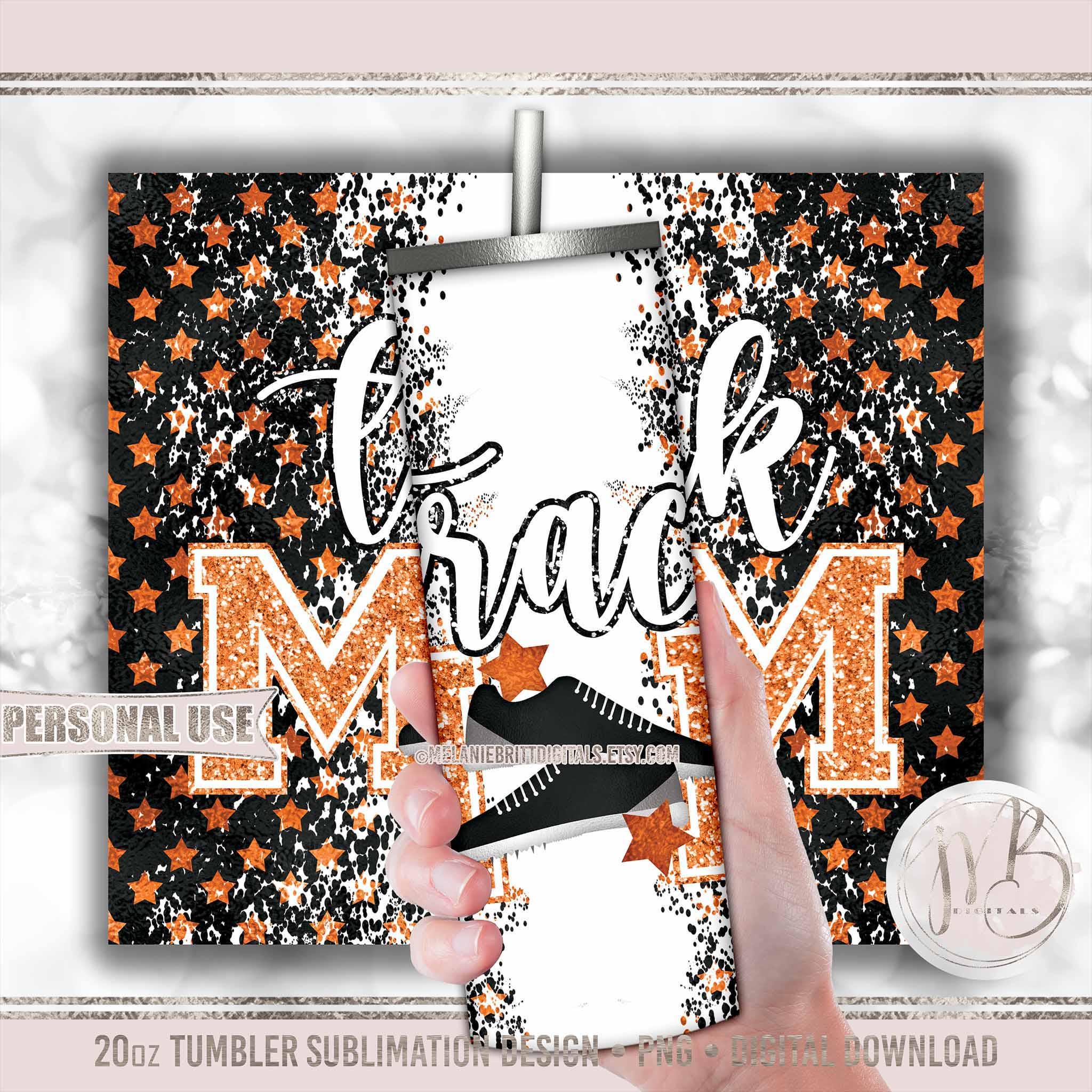 track mom tumbler, orange school colors, tumbler wrap, 20oz skinny tumbler, digital download, track shoes, track and field, school track meet, sublimation design, tumbler design, sublimation tumbler, DIY print and press, MelanieBrittDigitals