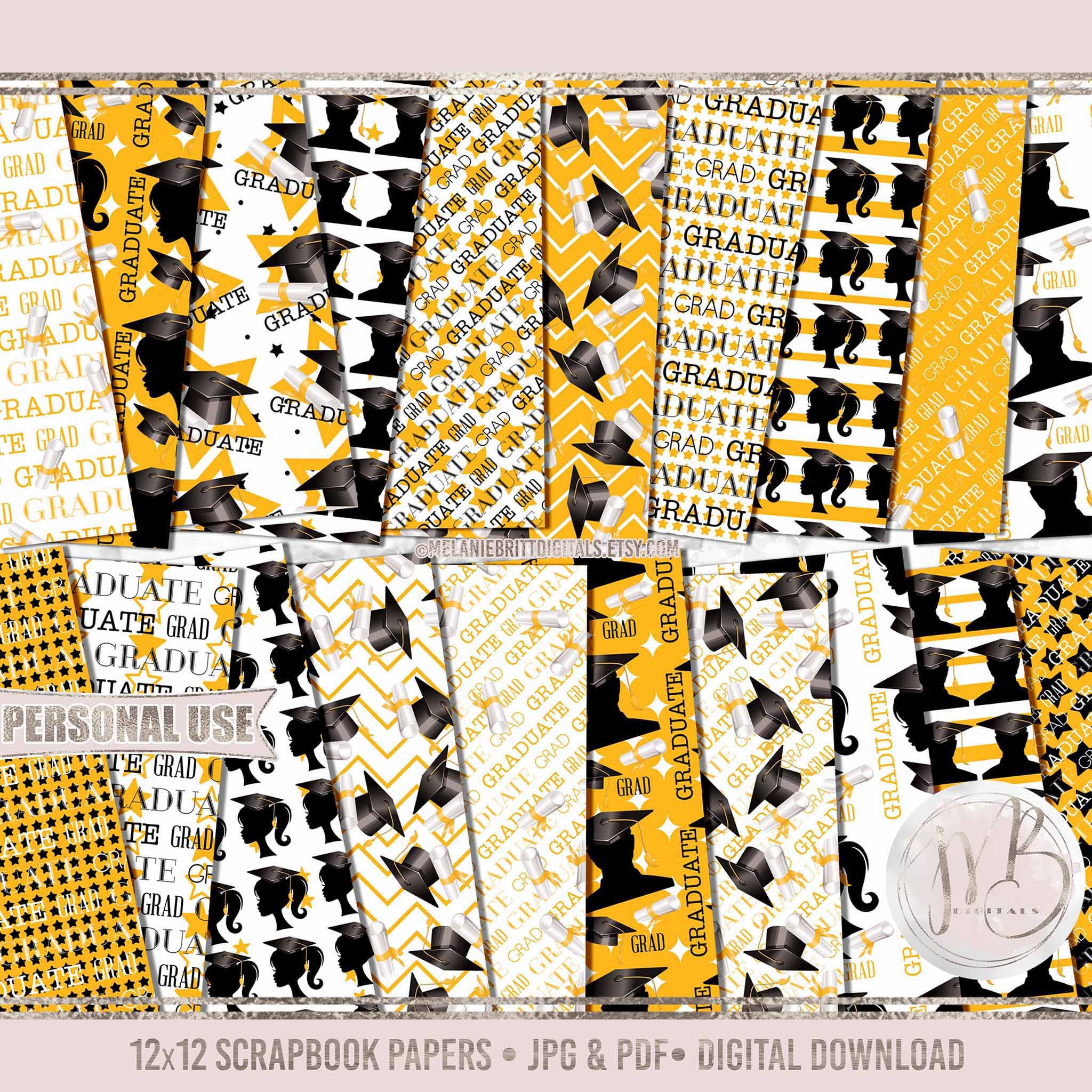 Athletic Gold Graduation Scrapbook Paper Download • Boy and Girl Graduates Mortarboard Diploma • Printable Paper Crafts 20 12x12 JPG & PDF